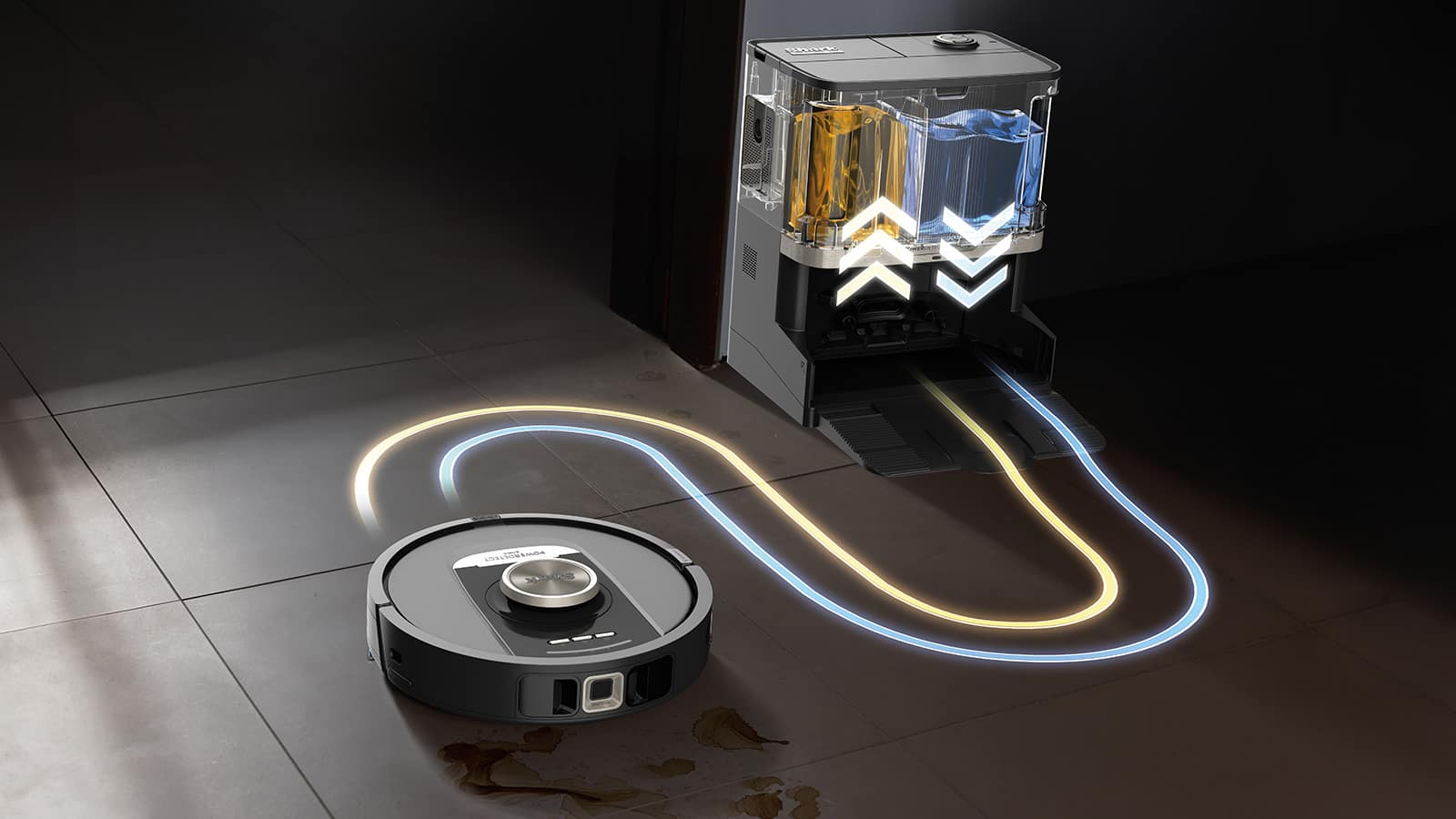NeverTouch-bas för upp till 60 dagars självtömmande bekvämlighet: NeverTouch-basen har två separata behållare – en för rent vatten och en för smuts och skräp – och är underhållsfri i upp till en månad.