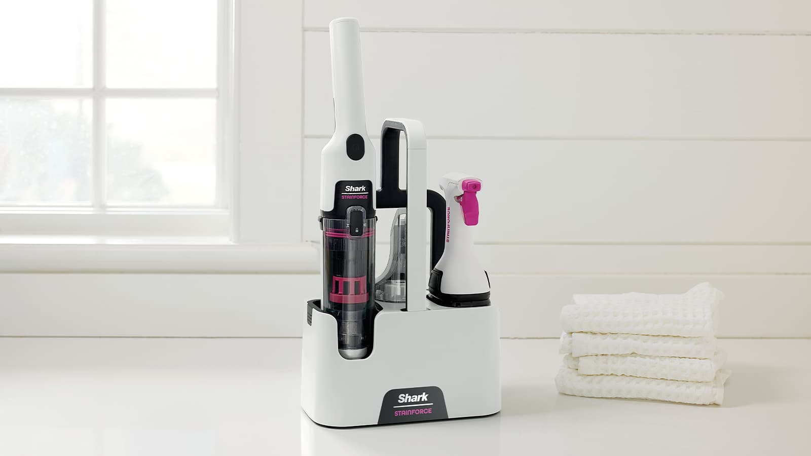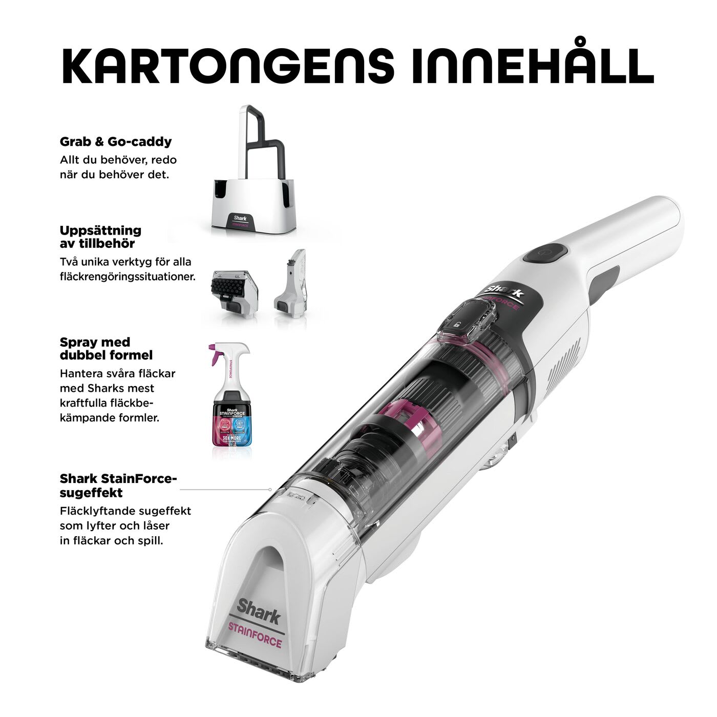 Dess kraftfulla dubbelmotorsystem ger kraftfull fläckeliminering* i hushållet, medan Sharks dubbla sprayformel ger 30X mer fläckbekämpningskraft** för att bryta ner och omedelbart eliminera fläckar och lukter från mattor, klädsel, bilinteriörer med mera***. Oavsett om det är spilld juice från barnen eller leriga tassavtryck från hunden så hjälper Shark StainForce dig att snabbt och enkelt rädda dina ytor från vardagens olyckor.